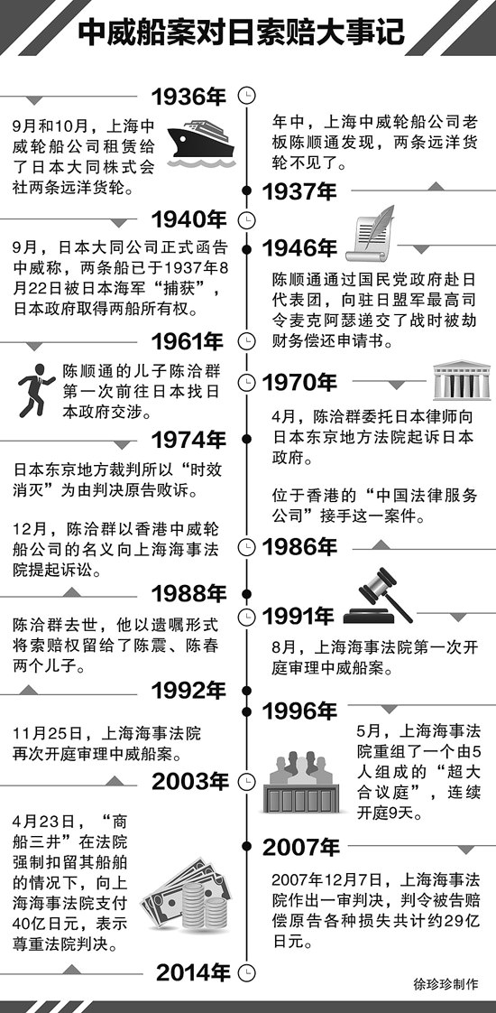 此后,陳順通不斷通過(guò)各種途徑查詢兩條船的下落。3年后的1940年9月4日,日本大同公司正式函告中威稱,兩條船已于1937年8月22日被日本海軍“捕獲”,日本政府“依法”取得兩船所有權(quán),并由日本遞信。唇煌ú——記者注)通過(guò)訂立租船合同將兩船再交予大同公司營(yíng)運(yùn)。