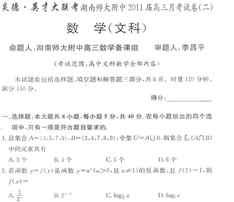 湖南省師大附中2011屆高三上學期月考試卷(二)(數(shù)學文)掃描版