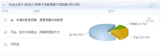 12月22日新浪教育頻道發(fā)起了以“你會讓你的孩子(或自己)報(bào)考自授文憑的南方科大嗎?”為主題的調(diào)查。在短短兩天的時(shí)間里,有近萬名多位網(wǎng)友參與了投票。網(wǎng)友們會給我們什么帶來什么答案呢?