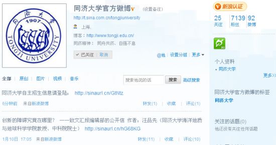 同濟(jì)大學(xué)新浪官方微博發(fā)布該校2011年自主招生動態(tài)信息