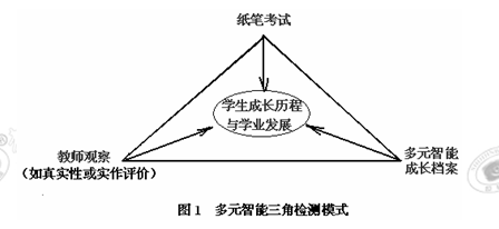 評價(jià)方式多元指多元智能教學(xué)的評價(jià)并不限于紙筆測試的分值維度,更多地注重學(xué)生智能發(fā)展的其它評價(jià)維度。臺灣學(xué)者張稚美認(rèn)為,多元智能教學(xué)的評價(jià)應(yīng)該是一個(gè)“三角檢測模式”,即標(biāo)準(zhǔn)測試、教師觀察(如真實(shí)性或?qū)嵶髟u價(jià))和多元智能成長檔案三方面評價(jià)。目的是多角度全面評價(jià)學(xué)生的成長歷程與學(xué)業(yè)發(fā)展。(如圖1)