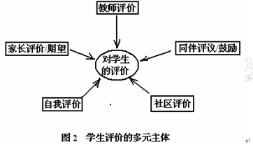 評價(jià)主體的多元化,一方面可以從多個(gè)分面、多個(gè)角度出發(fā),對教育活動進(jìn)行更全面、更客觀、更科學(xué)的評價(jià),另一方面,由原先的評價(jià)對象成為評價(jià)主體的教師和學(xué)生,在進(jìn)行評價(jià)的過程中,也不再處于過去單純的被動狀態(tài),而處于一種主動的積極參與狀態(tài),充分體現(xiàn)了他們在教育活動中的主體地位,這十分有利于教師、學(xué)生不斷對自己的教育活動和學(xué)習(xí)活動進(jìn)行反思,對自己的活動進(jìn)行自我調(diào)控,自我完善,自我修正,從而不斷提高教育的質(zhì)量和效率。(如圖2)