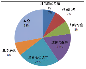 若以知識點模塊分類可大致分為細胞組成及結構、細胞代謝、細胞增殖、遺傳與變異、生命活動調節(jié)、生態(tài)系統(tǒng)和實驗七部分。